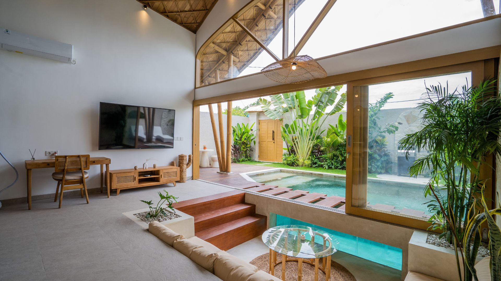 Source: Photos by KoskakiLocated in the peaceful coastal area of Kedungu, this eco-friendly 2-bedroom villa blends sustainable design with modern tropical living. Designed with a distinctive bamboo canopy structure and natural stone finishes, the villa features an airy open layout, a 6×3 m private pool, and a sunken lounge with a glass see-through window overlooking the lush garden.