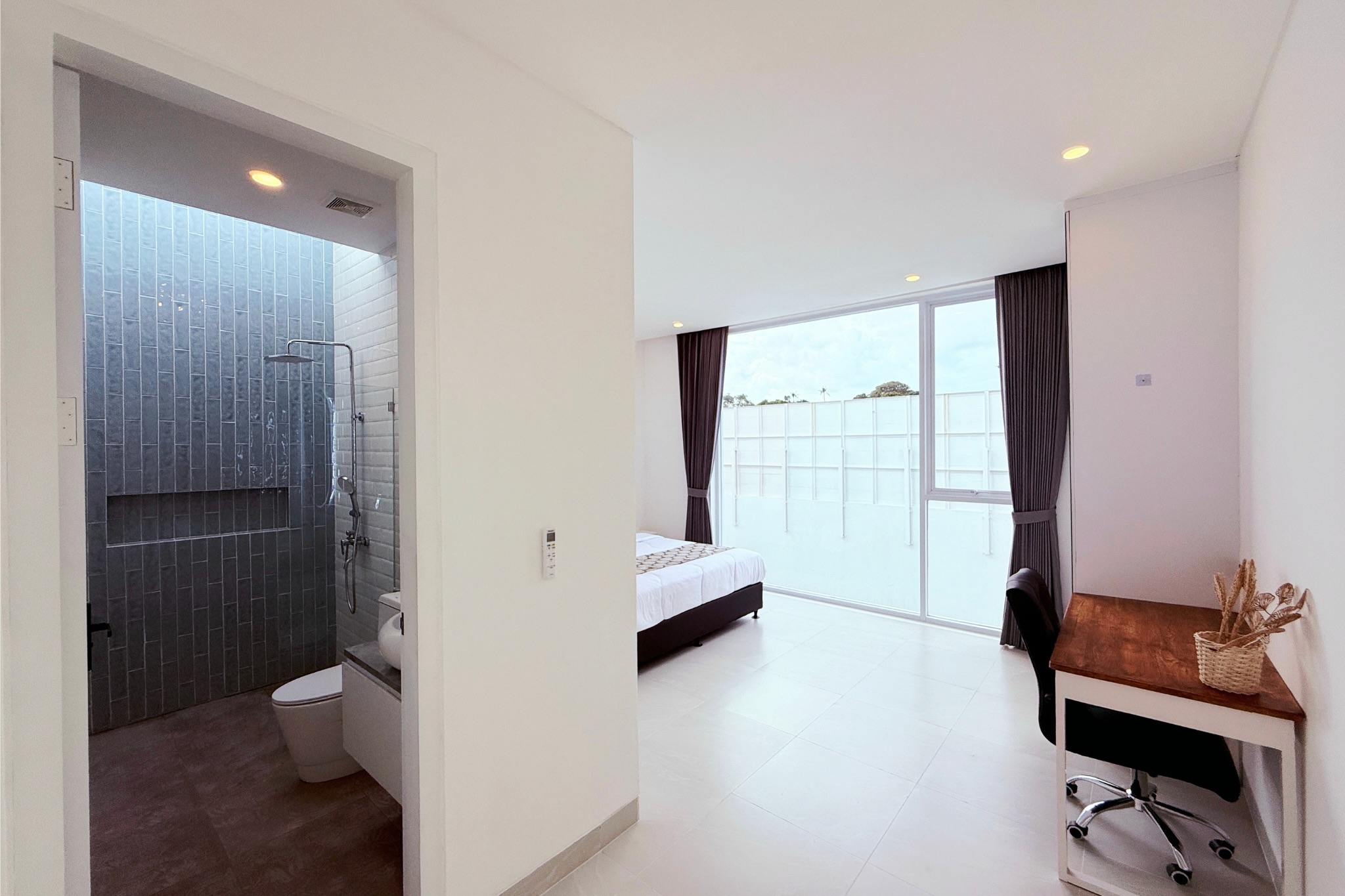 The design is practical yet modern: the first floor offers a bright open-plan living room, a fully equipped kitchen, and direct access to your private swimming pool. There’s also plenty of storage space — something you don’t always find in Bali villas. On the second floor, you’ll find two spacious bedrooms, each with its own ensuite bathroom, perfect for both homeowners and holiday rentals.