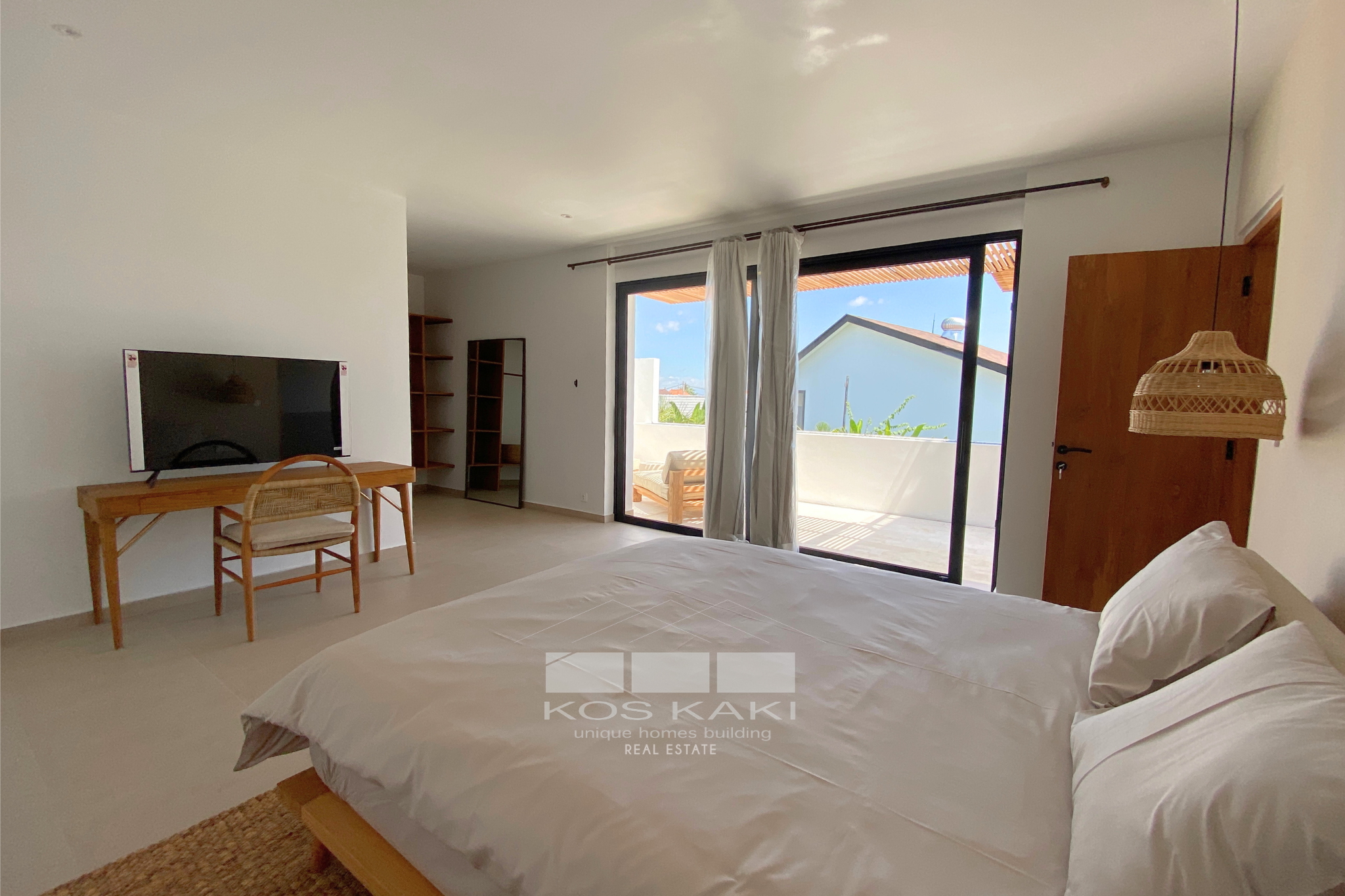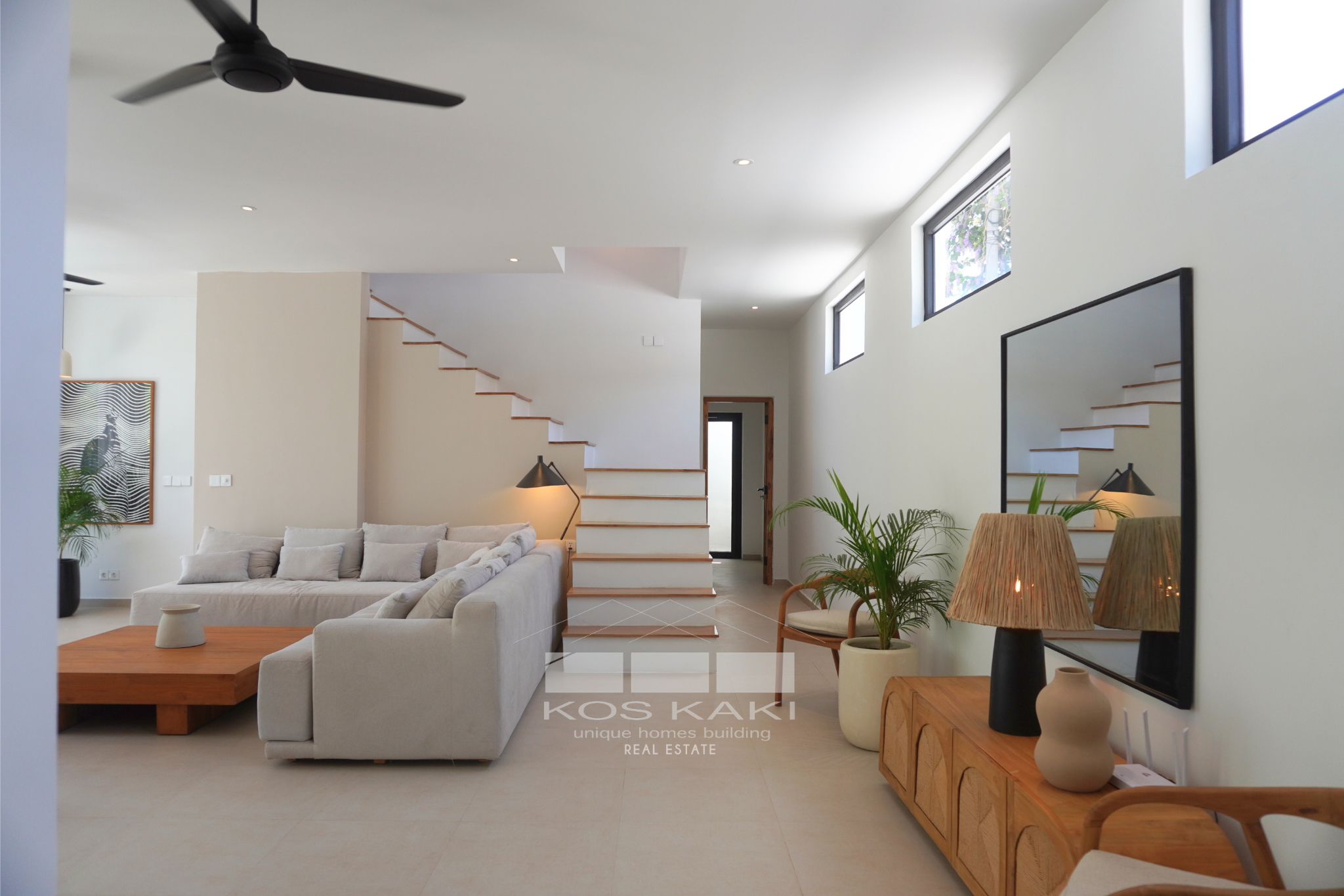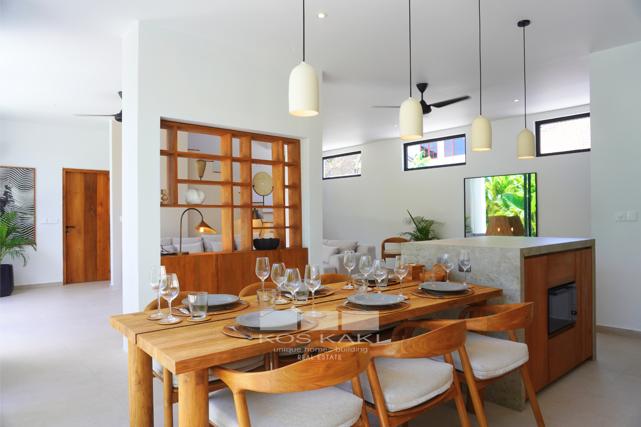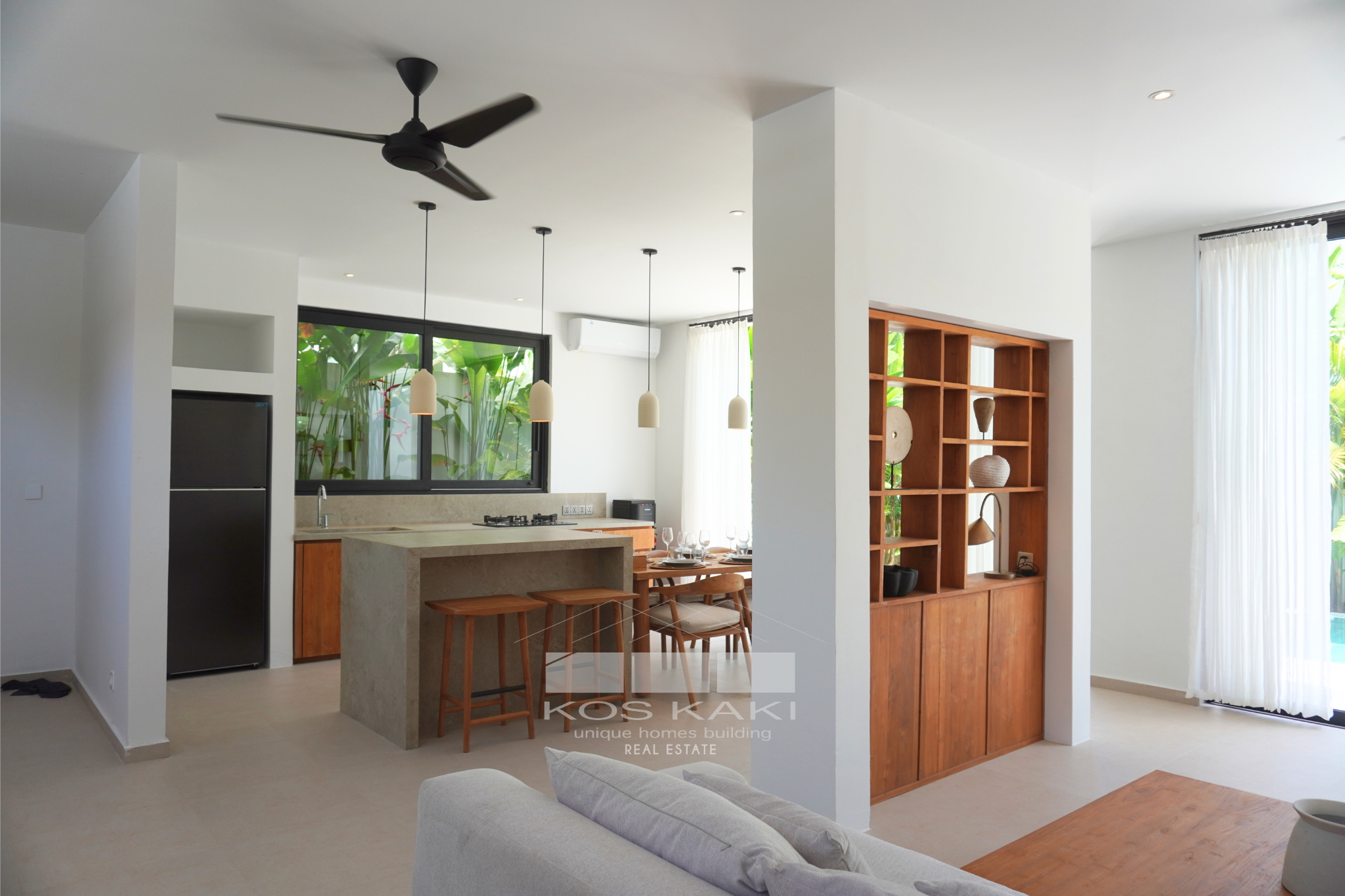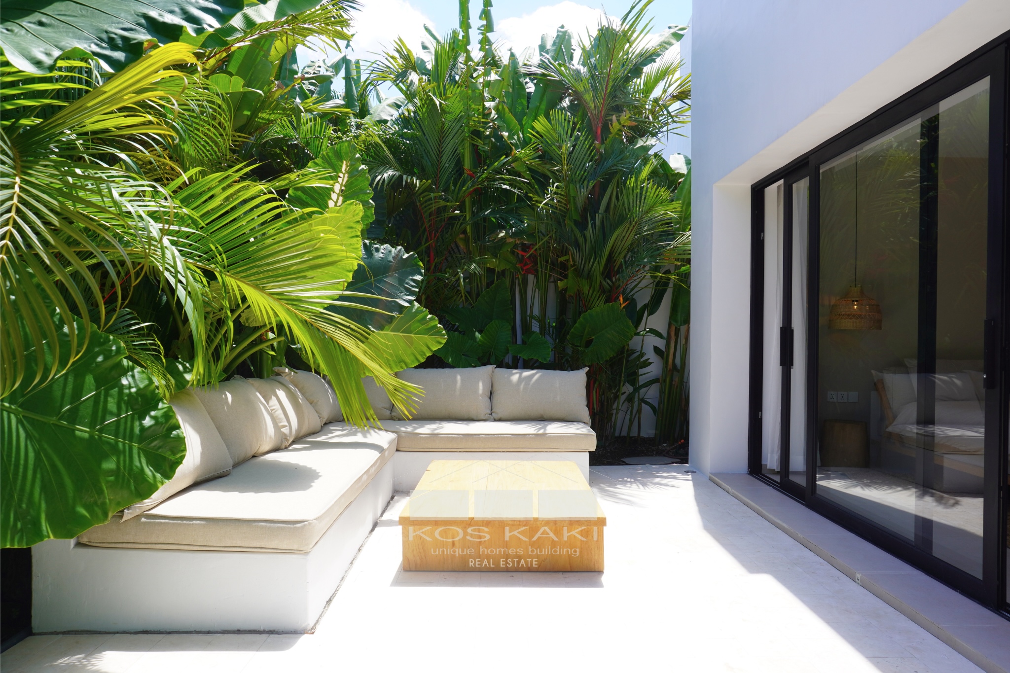This second unit of the three villas offers a slightly larger living area, creating a more seamless flow between the living room, kitchen, and pool. The open-plan design gives everyone in the house the freedom to move comfortably while still feeling connected.